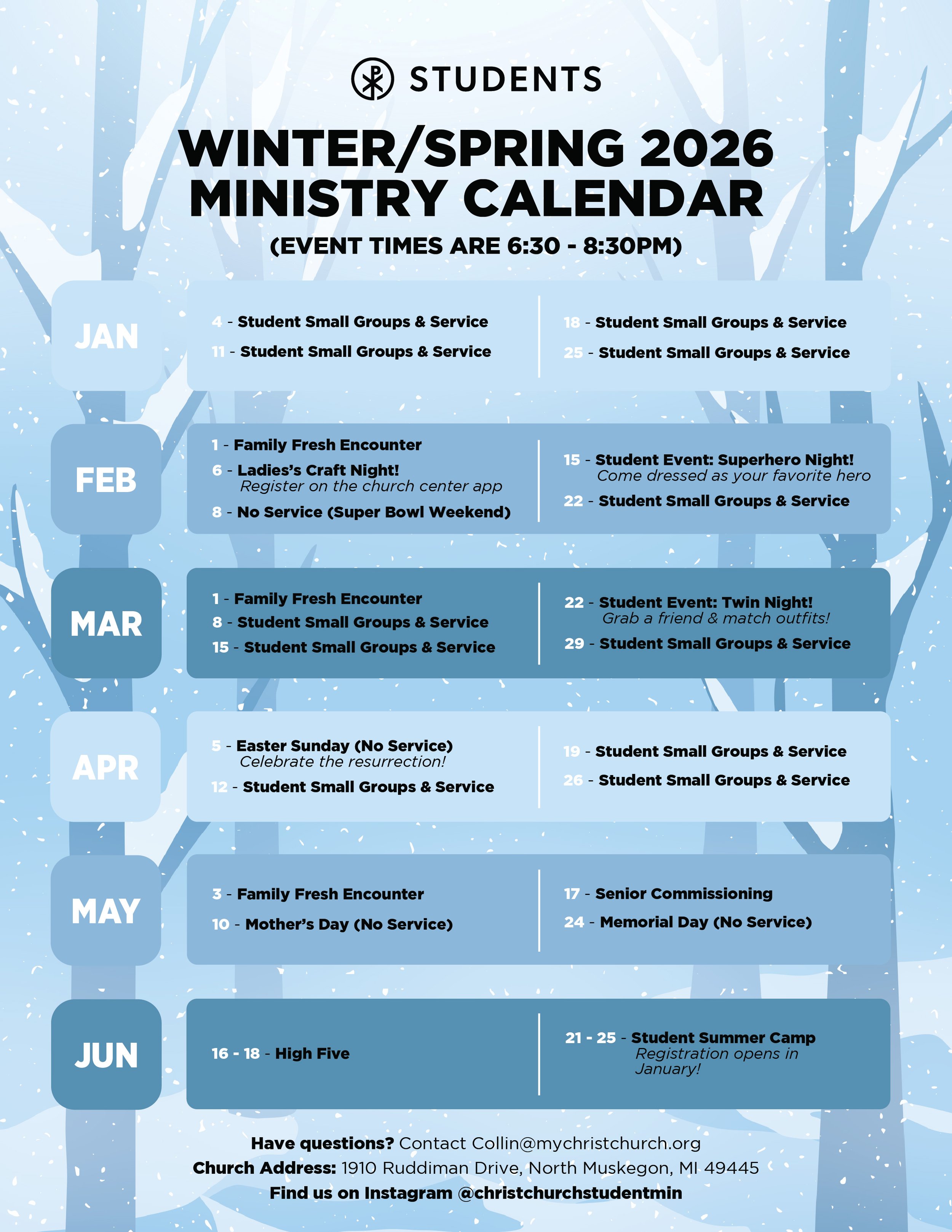 On this special night, our regular student gathering transforms into a powerful celebration and commissioning for our graduating seniors. Families are invited to join us as we worship, share a meal, and reflect on the stories of how God has moved in these students’ lives, and where He’s leading them next. Together, we’ll honor their journey, speak truth over their future, and send them out with gifts, prayers, and purpose.